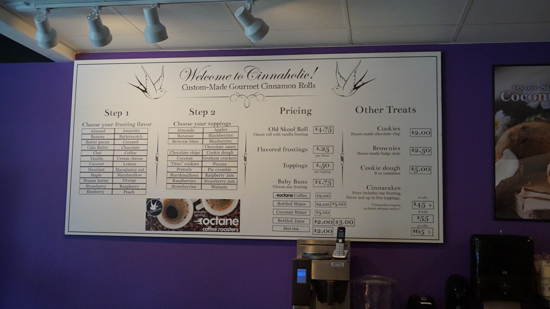 Keep in mind that the Atlanta location is small with little indoor or outdoor seating. This is not your typical cinnamon bun store. Each bun is made to order. I was overwhelmed at first when we saw the large menu. They have at least 24 different frostings like chai tea, butter pecan, caramel, and raspberry. Then there are 21 toppings to choose from, like strawberry, blueberry, cookie dough, brownie bits, and walnuts. I also learned they used beet sugar instead of regular sugar because it’s never processed with bone char. Ross, the manager on site, directed us to a display of top sellers on the front of the register.