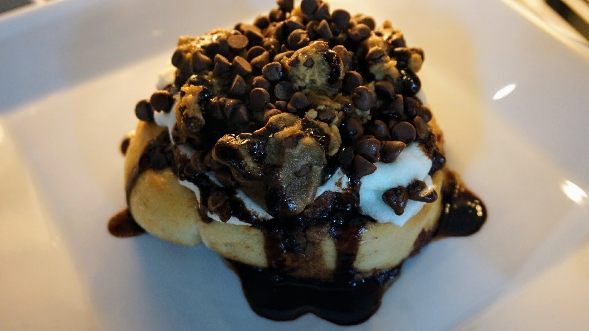 We eventually decided on one called “show me the dough.” This cinnamon bun was topped with vanilla frosting with vegan cookie dough, along with vegan-free chocolate chips that are also cholesterol free. When it came out, we saw a generous bun sized for two. After eating, I was surprised that we did not feel heavy or tired.