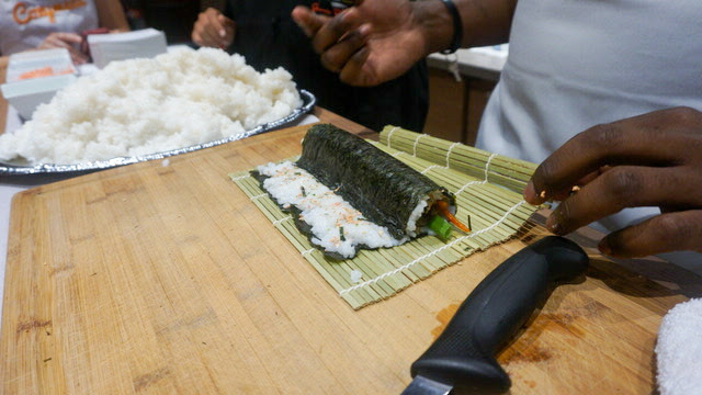 Next, Chef Jarvis demonstrated how to make a sushi roll step by step. This was so essential. After the demonstration, we all selected our ingredients and made our own sushi rolls. Mine had more protein and was more of a burrito than a sushi roll.