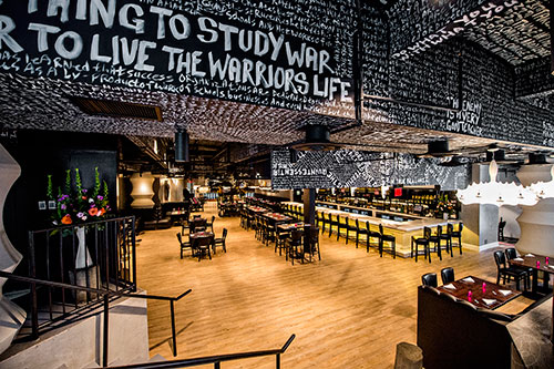 Now inside, the restaurant has a unique Neo-Victorian decor with its white concrete bars, black leather banquettes, and large-scale artworks of local artists. There are beautiful chandeliers, and the hand-painted ceilings express contents from Sun Tzu’s The Art of War.