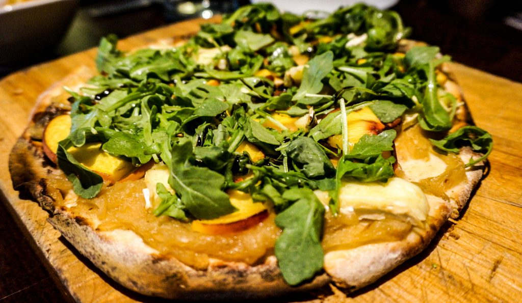 For starters, we both decided on the grilled peach flatbread. The ingredients were a little hard to see. The flatbread is covered with fresh arugula, and below it, you can see fresh slices of peaches, caramelized onions, Brie, and a taste of the balsamic glaze. Now, this was the first time I had brie on flatbread. It had a light, sweet, and creamy taste. Our server advised us this was a remake of a popular flatbread that had thin slices of ham.