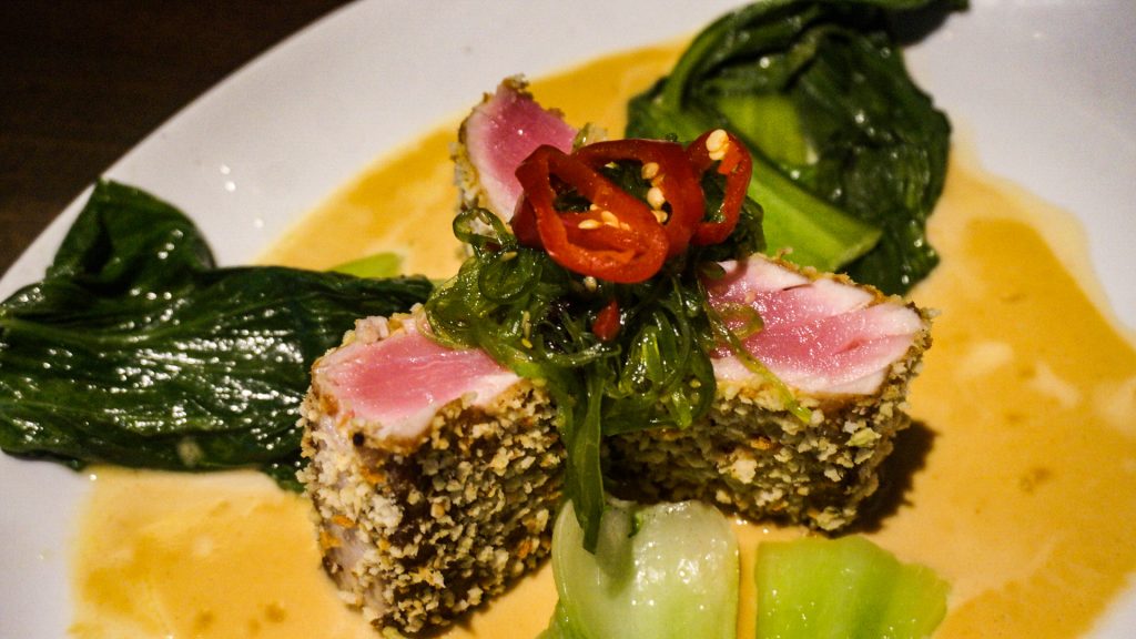 Now for the main course. We were very indecisive on what to get. Our server, Karl, recommended the wasabi-crusted ahi tuna. I loved the dish presentation. It was plated like a flower. The entrée consisted of bok choy, marinated seaweed salad, and miso emulsion.