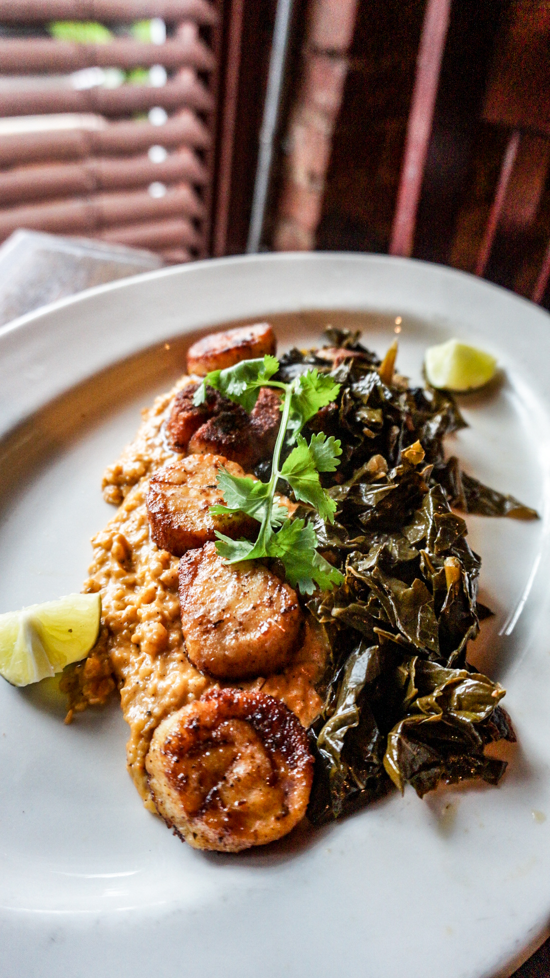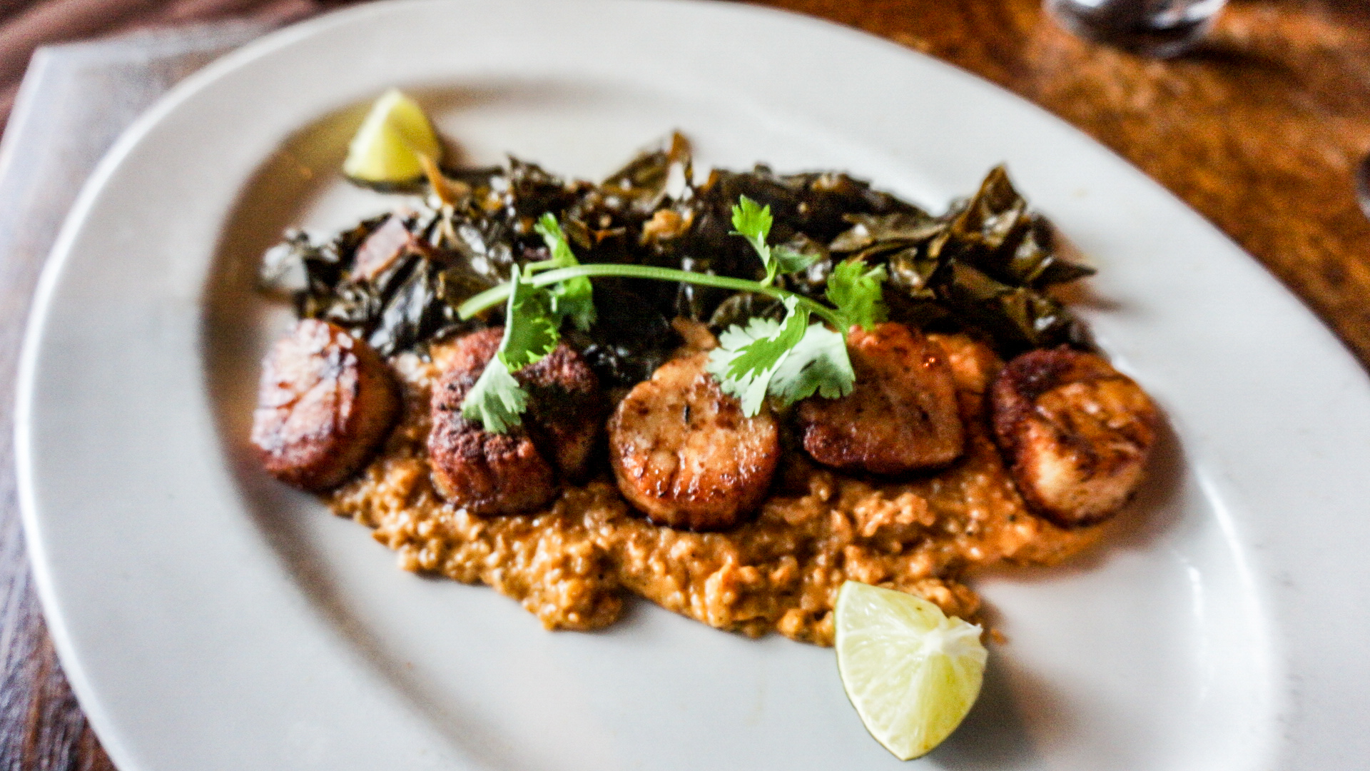 Second, we sampled the Seared Jumbo Diver Scallops. It included Fresh Chile rub pan-seared sea scallops with fire roasted tomatoes, serrano stone ground grits, and smoked bacon cider collard greens. This dish was unique. I loved how the sea scallops had a unique outside texture which was somewhat crusted outside and moist inside. The collard greens were what kind of threw me off for a second, Most people who grew up with collard are used to a sour or vinegar taste. These were sweet with a hint of bacon flavor. I loved it, It complemented the grits splendidly