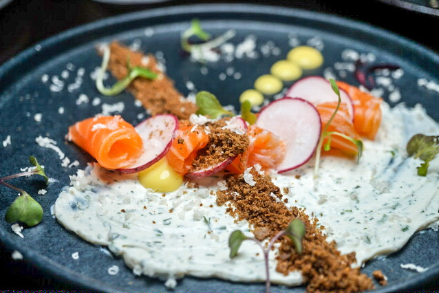 The third appetizer we had was Crudo Salmon with shaved radishes that consisted of garlic aioli, spicy pumpernickel crumble, and dill creme fraiche. The dish was delicious and well-balanced; we had to spread the salmon and the sauces together to get the full taste.