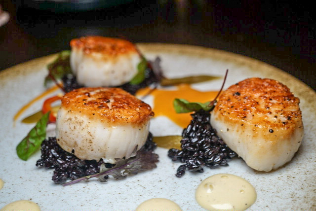 After our four courses of excellent small plates, we decided to try the Seared Diver Scallops. This fantastic entree’ consists of charred leeks, forbidden black rice, roasted garlic hollandaise, and Fresno chili. I never tried forbidden black rice before. Gina, our server, gave us a little history lesson of the unique rice. Forbidden Rice was only reserved for the Chinese Emperors to secure their long life and good health. Eventually, common people were allowed to eat the rice. Since then, it has become a healthy staple that is said to be to deliver a long life and good health.