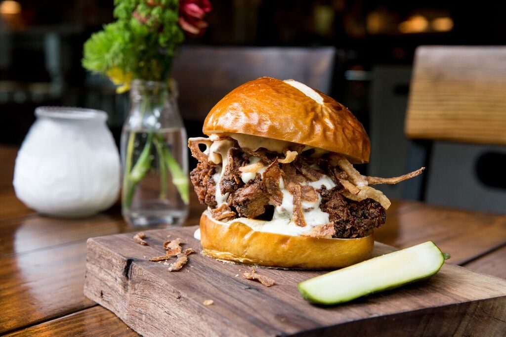 First-come-first-serve, Hampton + Hudson’s 4 p.m. sandwich, served with sweet tea brined + buttermilk fried chicken thigh, Creature Comfort queso, fried onion straws, bama BBQ and house pickles served on a Ratio Bakery pretzel bun, is a sandwich that foodies must get their hand on. Available Monday through Friday beginning at 4 p.m. Hampton + Hudson is located 299 Highland Avenue NE Atlanta, GA 30307. For more information, visit http://www. hamptonandhudson.com/. Stay connected on Twitter at @_HamptonHudson and on Instagram at @HamptonHudson and on Facebook at www.facebook.com/ hamptonandhudson.