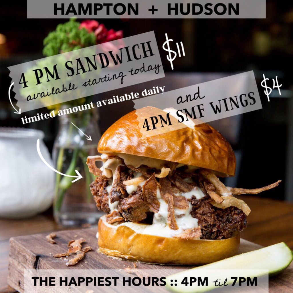 Thursdays guests can “Holla for Five Dollars” with a $5 featured cocktail and beer. Available all week from Monday through Friday, hungry diners can chow down on Hampton + Hudson’s Happiest Hour Menu from 4 to 7 p.m. featuring Executive Chef Savannah Sasser’s 4 p.m. Sandwich, which is only available for a limited time each day for $11, and 4 p.m. SMF Wings for $4. To cap off the weekend, brunch is served from 10 a.m. to 3 p.m. on Saturdays and Sundays.